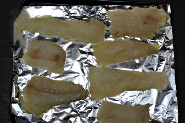 Bước 1. Đặt khô lên khay nướng có lót sẵn giấy bạc cho vào lò nướng vàng sơ. Sau đó xé nhỏ vừa ăn.