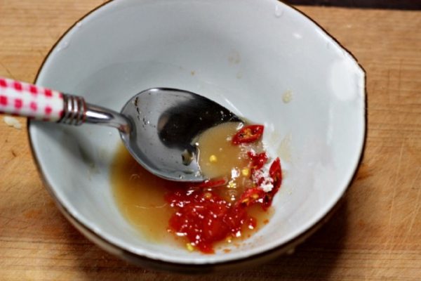 Bước 3. Cho 2 muỗng canh nước mắm, 2 muỗng canh đường, 1 muỗng canh tương ớt vào 1 cái chén, quậy đều.