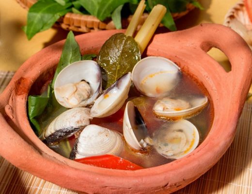 Canh nghêu nấu cùng với dọc mùng và me chua và mát, ăn với cơm rất ngon. Bát canh có hương vị thơm ngon, chua, rất hấp dẫn và tốt cho sức khỏe.