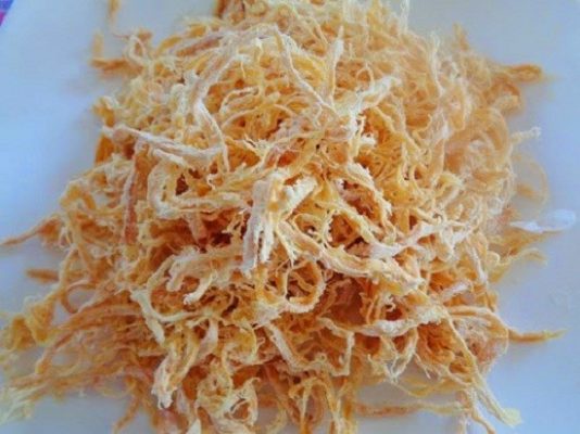 Bước 1: mực khô đập nát cho mềm rồi xé thành sợi nhỏ.