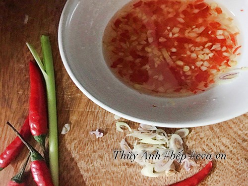 Bước 3: Tiếp theo, pha nước sốt chua ngọt; nước mắm, đường, dấm, nước sôi như định lượng và cho sả, ớt, hành băm nhỏ vào khuấy cho tan đều.