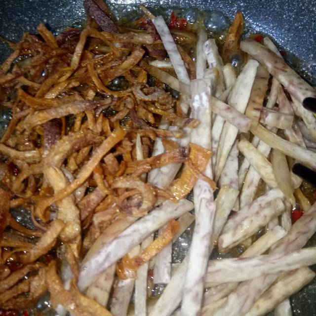 Bước 4: Phi tỏi thơm nấu phần sốt tan đường hơi sệt lại, thêm khoai và mực chiên đảo đều. Thêm bơ, hành tây cho thơm.