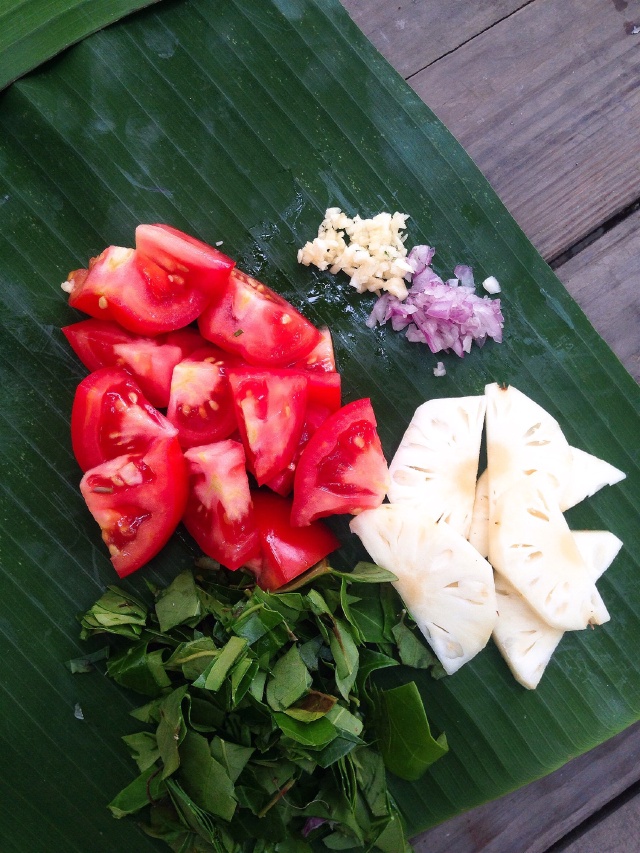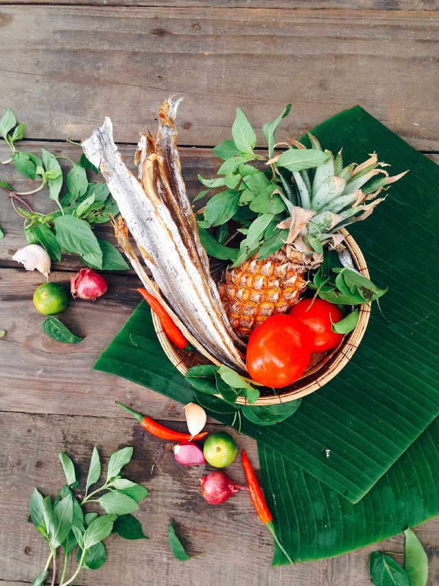 Bước 3: Sơ chế các nguyên liệu còn lại. Thơm gọt vỏ, rửa sạch, cắt lát. Cà chua rửa sạch, cắt miếng vừa ăn tương đương kích thước khô cá hố. Rau quế bỏ lá sâu, úa, rửa sạch để ráo nước, đem cắt nhỏ. Ớt rửa sạch, cắt lát. Hành tím, tỏi : lột vỏ, rửa sạch, băm nhỏ. Tắc (quất) cắt đôi, vắt lấy nước cốt. Lá giang rửa sạch, loại bỏ lá héo, úa, giập, sau đó để ráo nước, cắt nhỏ (hoặc vò nát).