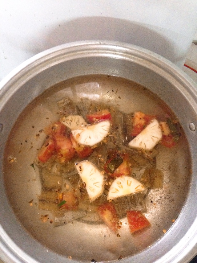 Bước 4: Giai đoạn thực hiện: Cho 1 muỗng canh dầu ăn vào nồi, phi thơm hành tím và tỏi. Cho cà chua, thơm vào đảo đều, nhanh tay để tạo màu. Tiếp tục cho khô cá hố, 1.5 tô nước lọc vào nồi, để lửa lớn, đun sôi.