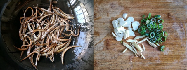 Hành lá xắt nhỏ. Tỏi lột vỏ, xắt lát. Gừng nạo vỏ, xắt sợi. Ớt xanh và ớt hiểm xắt khoanh tròn.