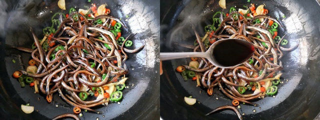 Bước 2. Giữ nguyên chảo, thêm dầu vào đun nóng, cho gừng tỏi và hành vào phi thơm, thêm vào ớt xanh cùng ớt hiểm, đảo đều. Sau đó cho cá khô vào trộn đều lên cho ớt bám quanh cá, nêm vào rượu nấu ăn, giấm và nước tương.Bước  3. Thêm vào 1 muỗng đường, 2 muỗng hạt nêm rồi trộn cho thật đều để cá thấm gia vị, chín vàng là được rồi đó. Tắt bếp, trút cá ra dĩa rồi thưởng thức thôi nào.