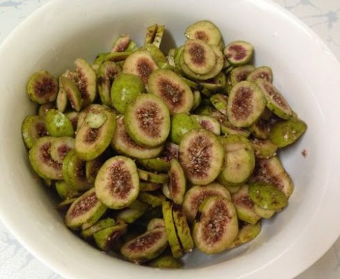 Lưu ý: Đem sung đã thái ngâm nước ấm pha muối khoảng 7 phút, sau đó vớt ra, để ráo nước. Cho vào ngăn mát tủ lạnh khoảng 10 phút để sung có độ giòn mà không bị chát.