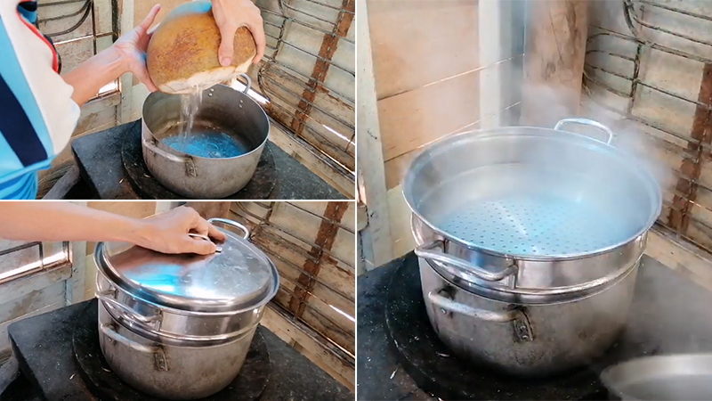 • Bạn rót nước trái dừa xiêm cho vào đáy nồi hấp, rồi đậy nắp lại.