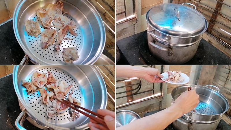 • Bước tiếp theo bạn xếp 100 gr khô mực vào trong xửng hấp, đậy nắp lại và hấp khô mực với nước dừa tầm 10 – 15 phút.