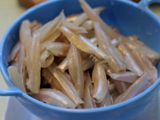 Bước 1. Cá cơm cắt bỏ đầu và ruột cá, rửa sạch, để ráo. Xốc đều vào cá 1/2 muỗng cà phê muối, để khoảng 15 phút trước khi chế biến.
