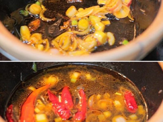 Bước 2: Đổ nước dừa tươi ra bát, lấy phần nước. Đun nóng 1 muỗng canh dầu điều, phi hành tím, đầu hành lá cho thơm, rưới vào nồi kho cá khoảng hai muỗng canh nước mắm, 1 muỗng canh đường và thêm khoảng 200-220ml nước dừa tươi, ớt trái hoặc ớt bột, đun sôi.